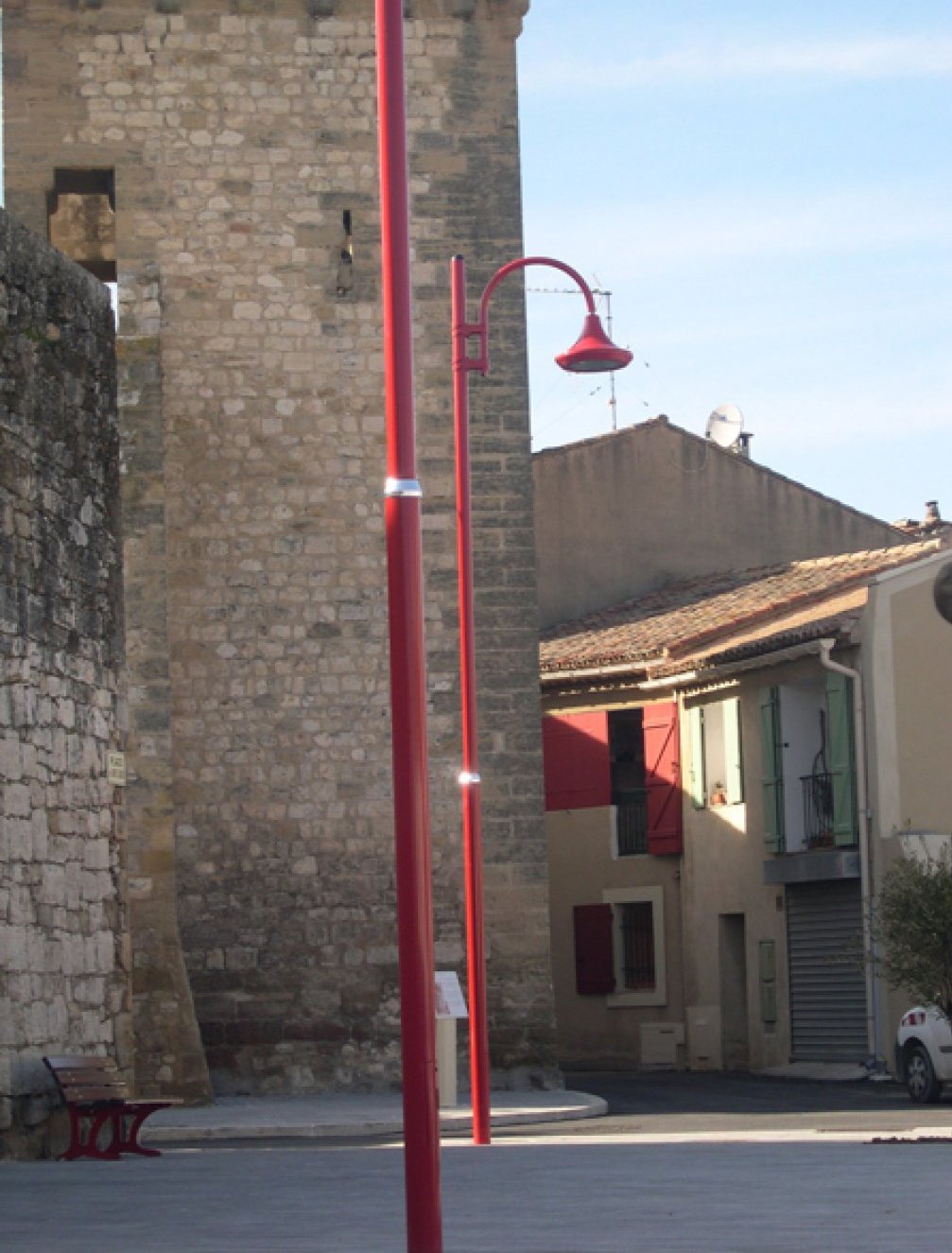 - Mât retreint en acier galvanise thermolaqué, avec crosse simple ou double fixe par systeme de brides, plusieurs possibilities de finitions.